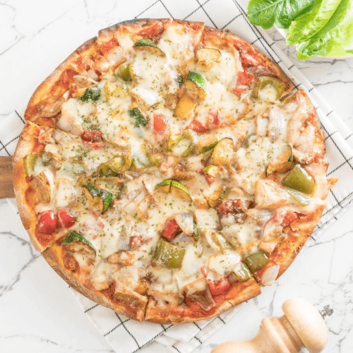 Mushrooms, green peppers, black olives, spinach, red onions, tomatoes, feta and mozzarella cheeses