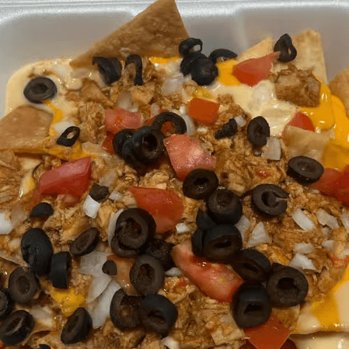 Your choice of seasoned ground beef or chicken, Cheddar cheese sauce, tomatoes, onions & black olives served over our original homemade chips, com tortilla chips, or waffle fries served with salsa and sour cream