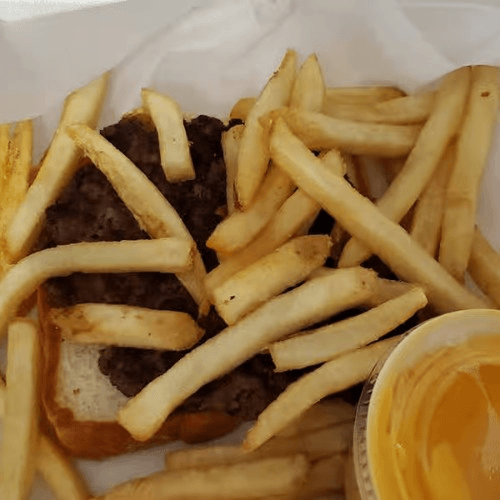 Hamburger, bacon, cheddar and mozzarella cheese, ketchup & mustard. Try adding signature fries or pickles for a whole new flavor!